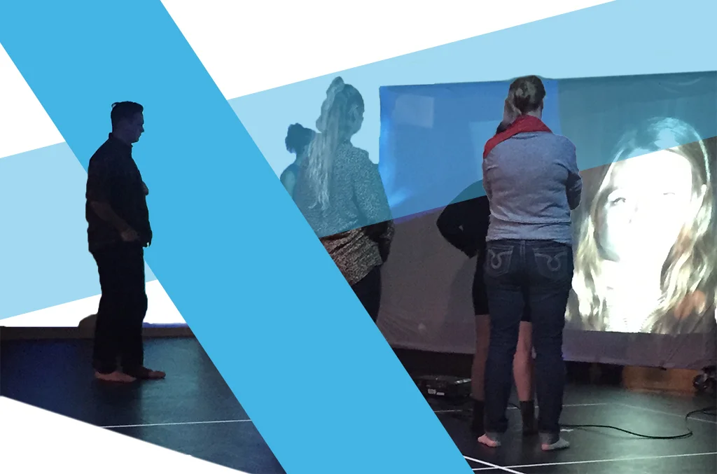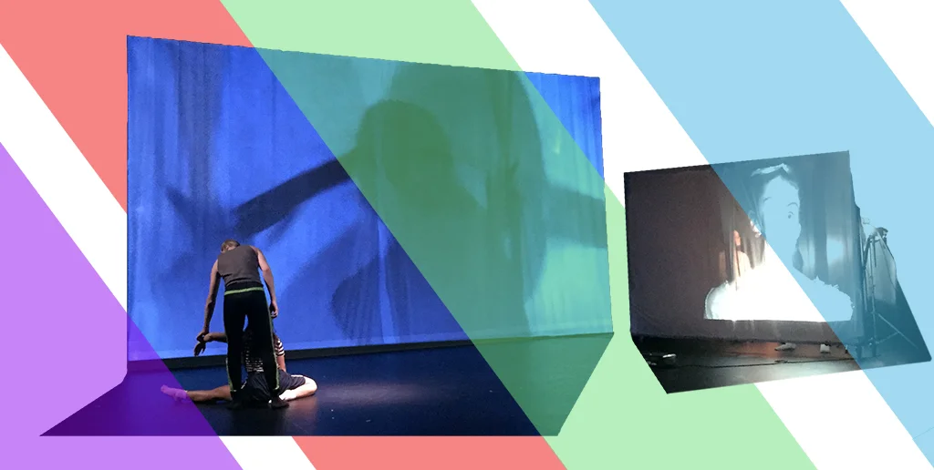 These thoughts were embodied in this particular student’s digital portrait exercise. The student’s face was scaled up and projected onto a screen from a live camera feed offstage, while two other students in the lab group improvised movement in front of a different, more abstract projection of a shadowy dancer. The screen with the student’s face was angled to “watch” the improvisation, creating the illusion that the real, offstage student could see what was happening. This configuration is interesting because the digital double “sees” without seeing, while the two dancers on stage can see and are influenced by the double—an example of what Dixon calls “the power of the virtual over the real” (16).